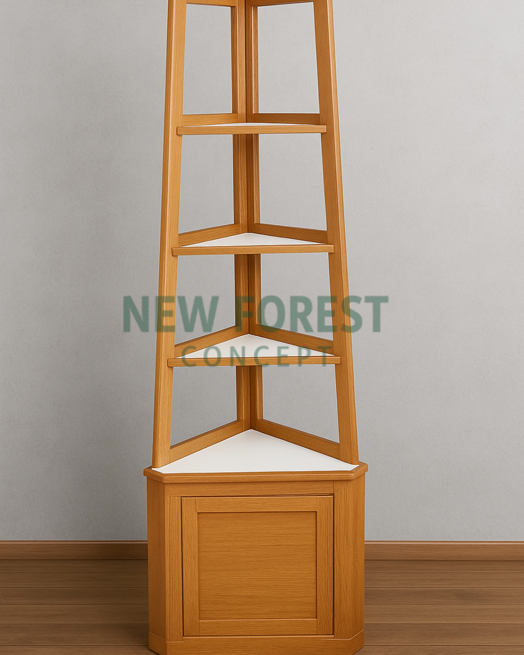 Meuble de rangement d’angle en hetre naturel massif avec étagères ouvertes et fermées